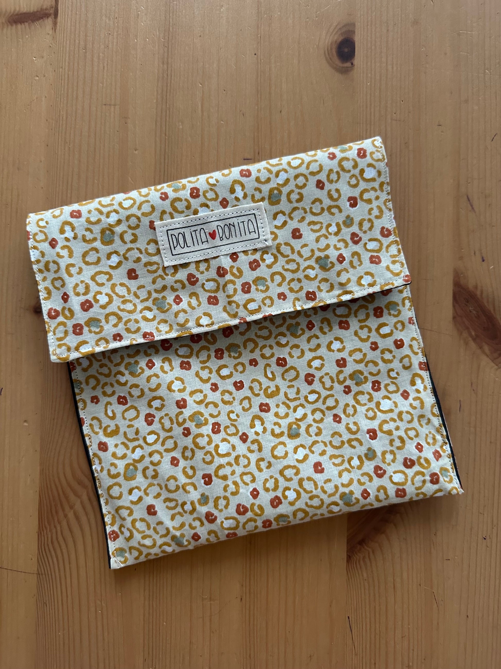 Producto hecho a mano, práctico y sostenible. Esta bolsa tipo sobre es apta para alimentos, ideal para llevar tu desayuno, merienda o cualquier pequeño snack de forma cómoda y segura.