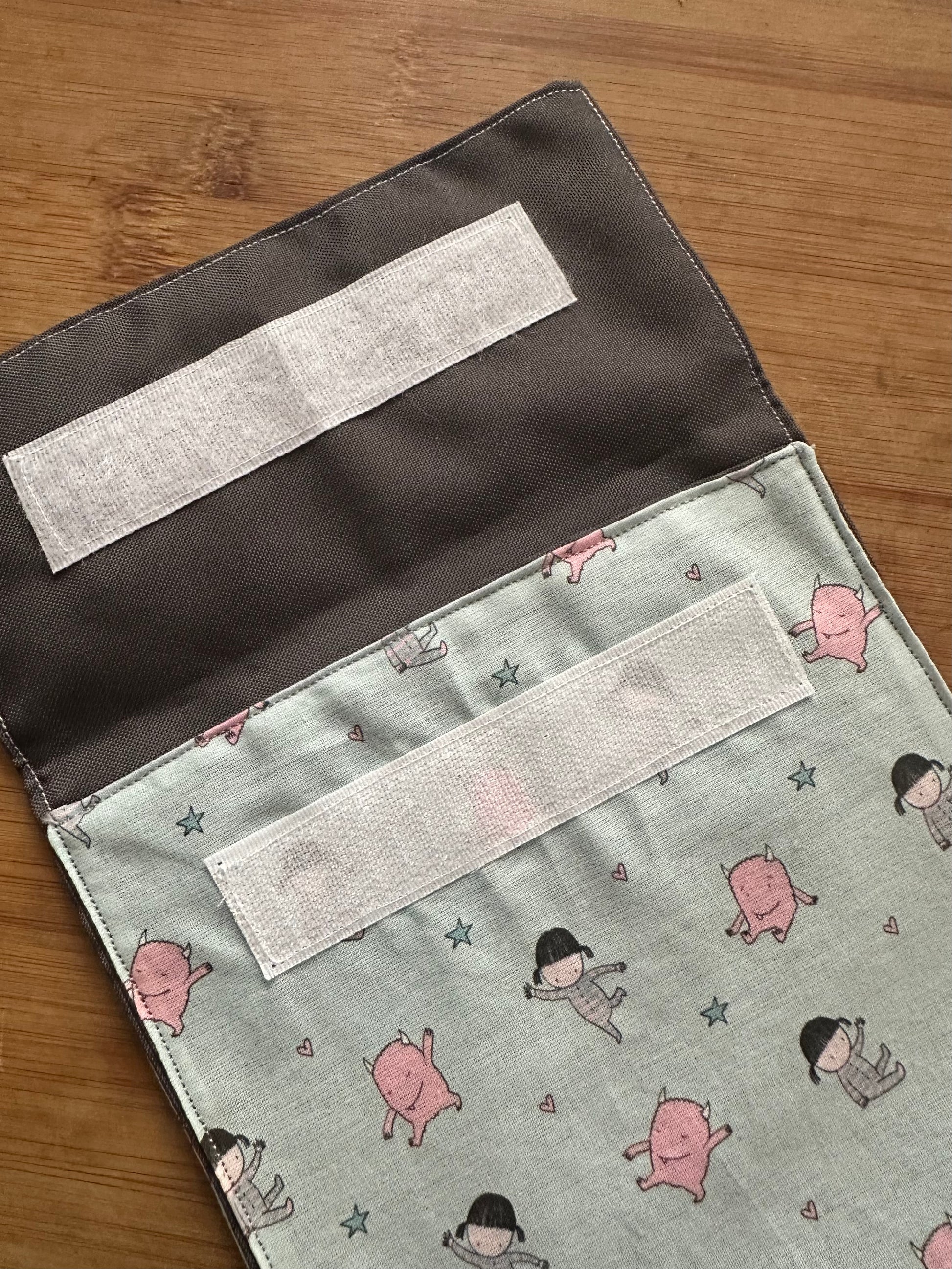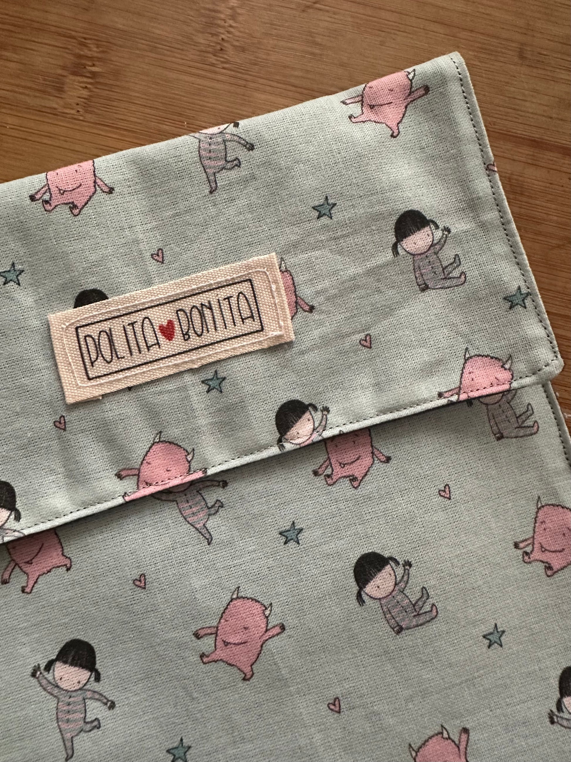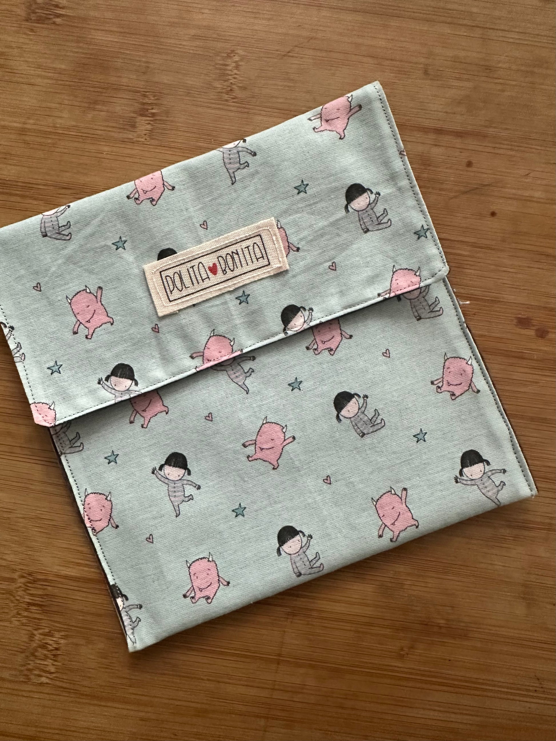 Producto hecho a mano, práctico y sostenible. Esta bolsa tipo sobre es apta para alimentos y te permite llevar cómodamente tu desayuno, merienda o cualquier snack siempre protegido.