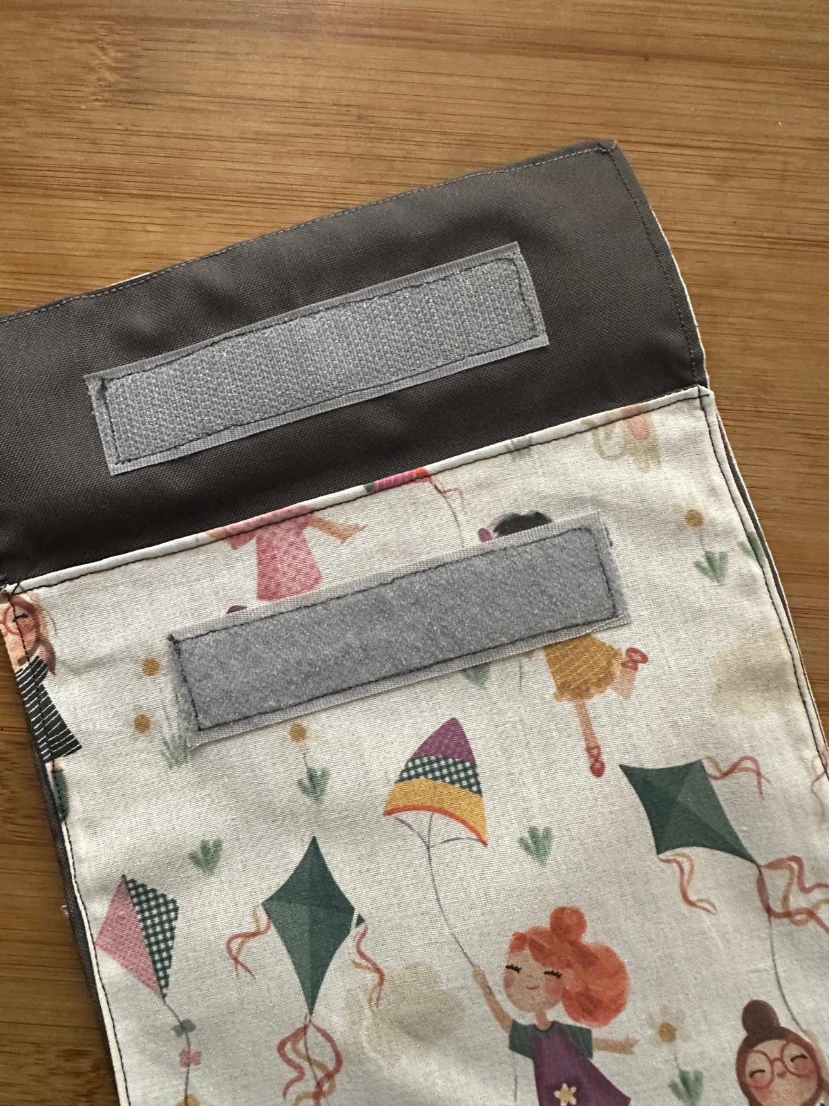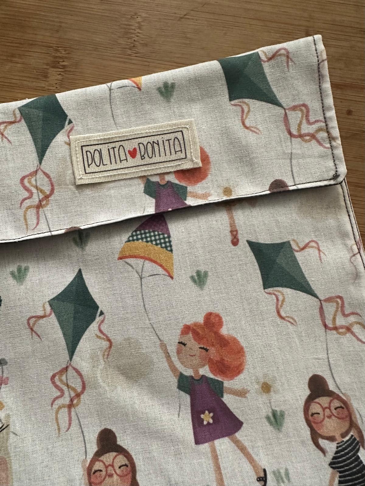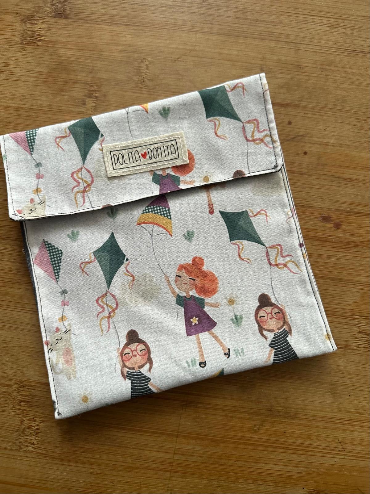 Producto hecho a mano, práctico y sostenible. Esta bolsa tipo sobre es apta para alimentos y te permite llevar cómodamente tu desayuno, merienda o cualquier snack siempre protegido.
