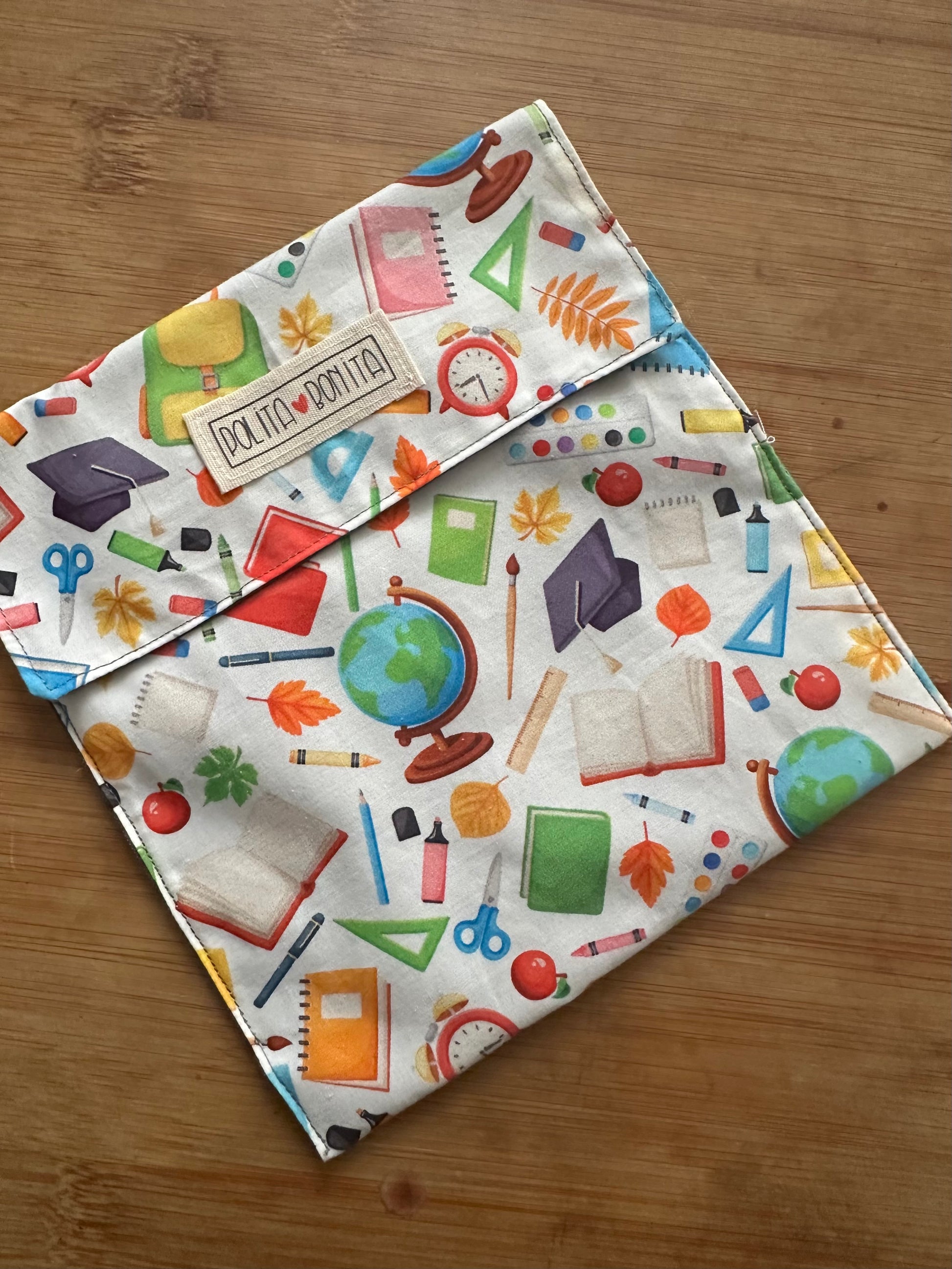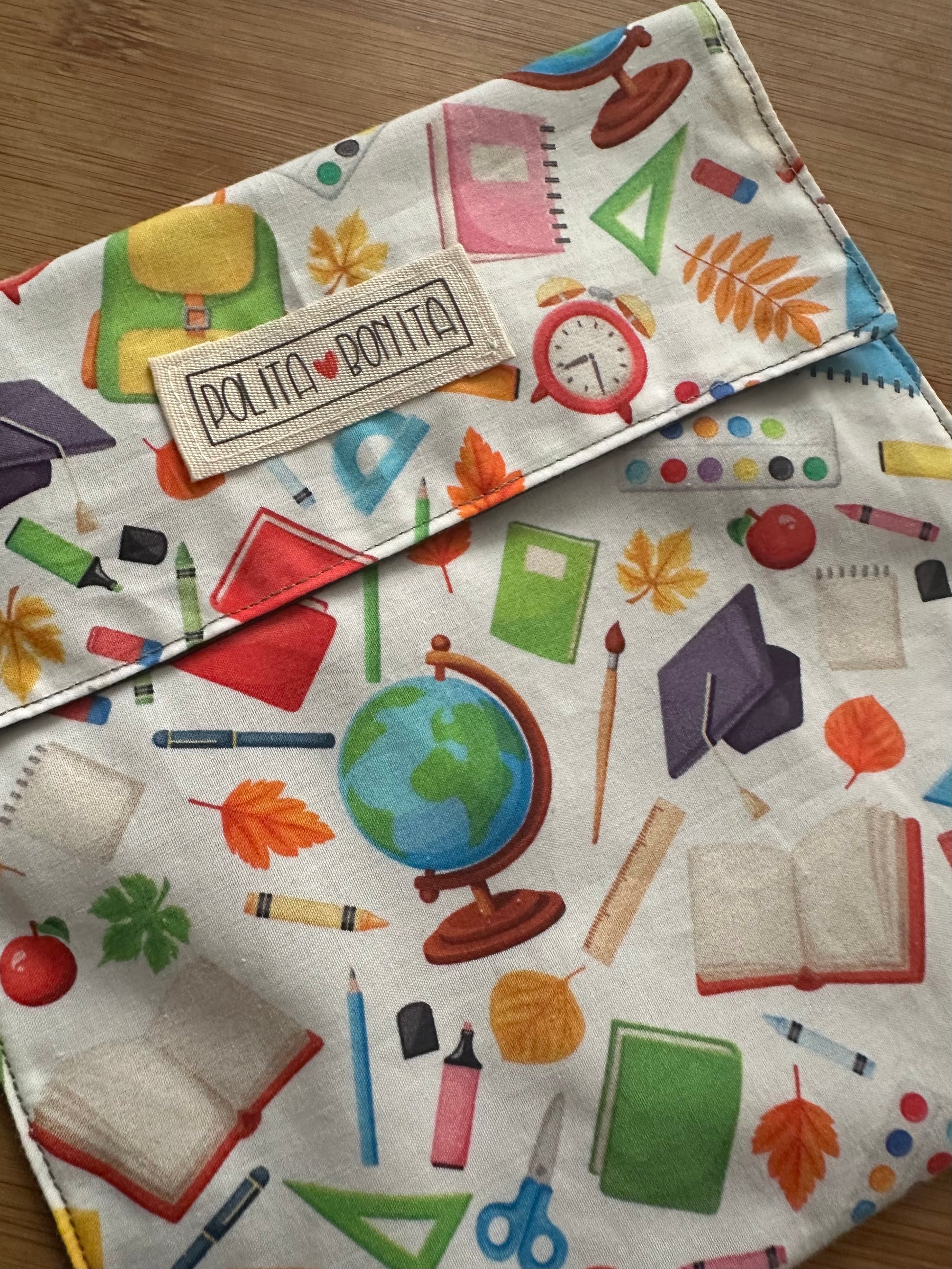 Producto hecho a mano, práctico y sostenible. Esta bolsa tipo sobre es apta para alimentos y te permite llevar cómodamente tu desayuno, merienda o cualquier snack siempre protegido.
