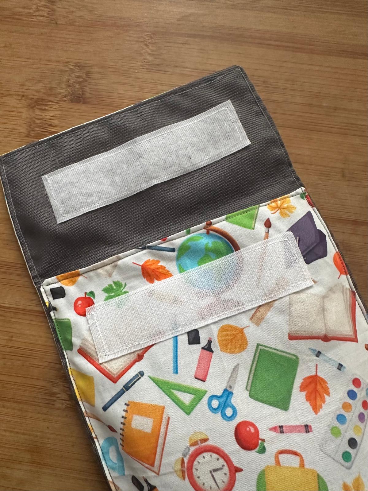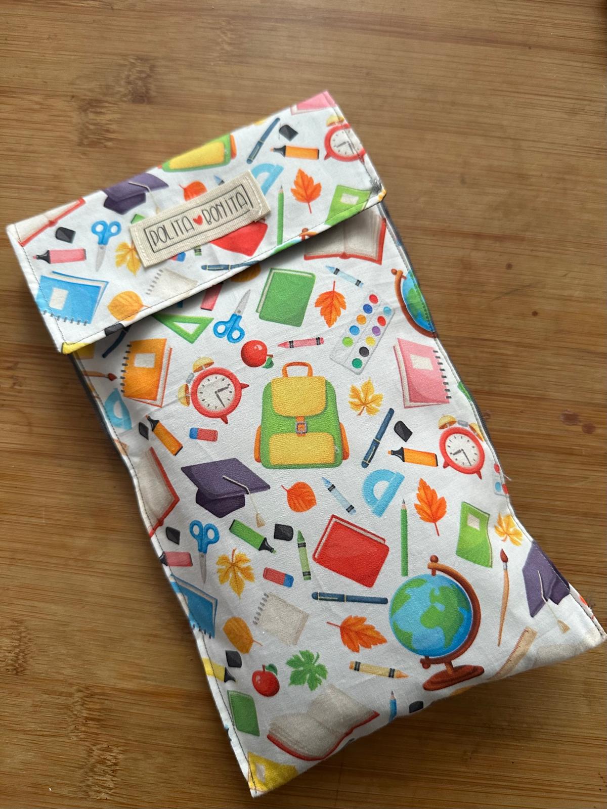 Producto hecho a mano, práctico y sostenible. Esta bolsa tipo sobre es apta para alimentos y te permite llevar cómodamente tu desayuno, merienda o cualquier snack siempre protegido.